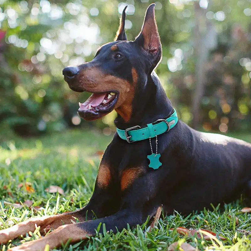Notre collier chien en cuir bleu confortable existe aussi en noir, rouge et marron !
